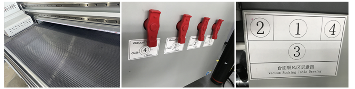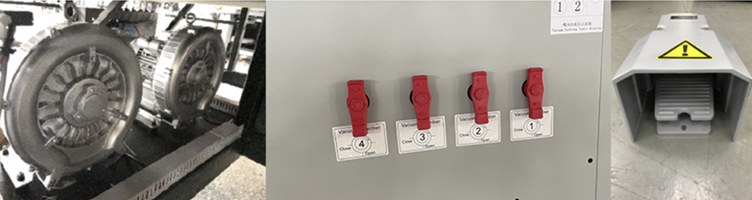 Two Powerful vacuum pumps for 4-zone air suction of the vacuum table. With respective control buttons, a pedal switch makes it capable reverse air blowing function for lifting the heavy medias easily(Optional). The Honey-Comb table and internal air pipe ducts for efficient and powerful distribution of vacuum effect.