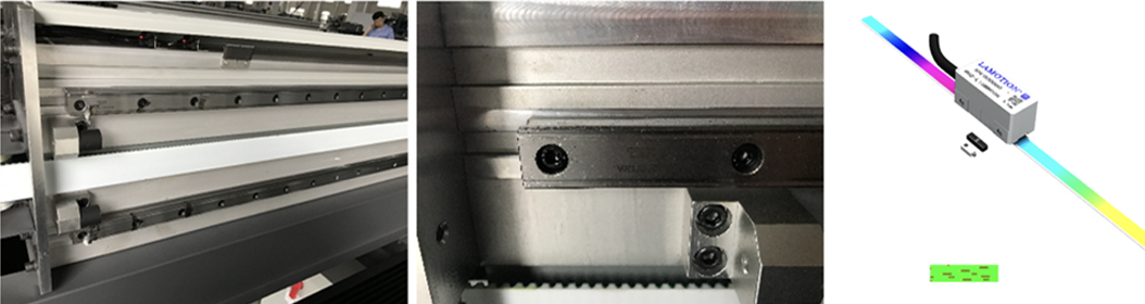 Equipped with Japanese THK silent guide rail with X axial metal raster which ensures straight carriage moving to achieve accurate printing and posibility of high driven speed. Y Axis driving by dual Delta motor belt system with Metal raster, deviation control within 1um.