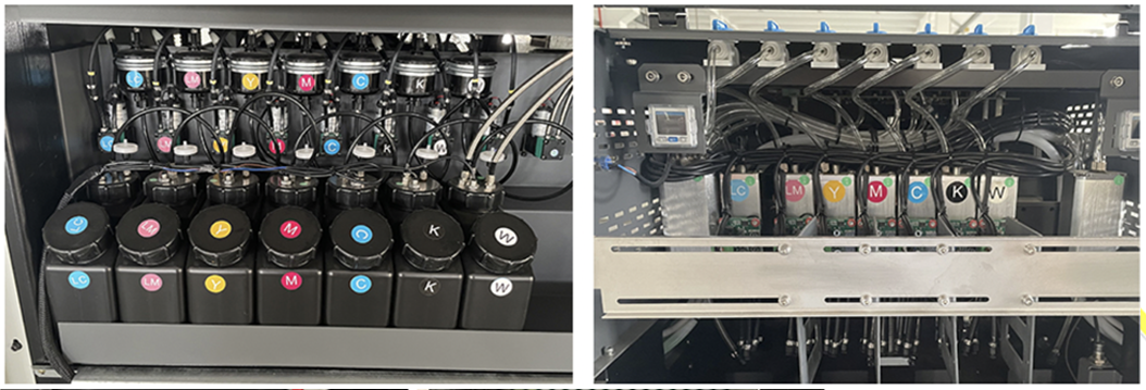 Automatic high-volume Ink Supply system ensures continuous printing. The white ink has automatic stirring and circulation system, which avoids the clog of the  white printhead. The system continuously circulates the ink between the Sub Ink Tank and Main tank; internal main tank. It equipped with Ink low level sensor, gives alarm once ink level below than setting.