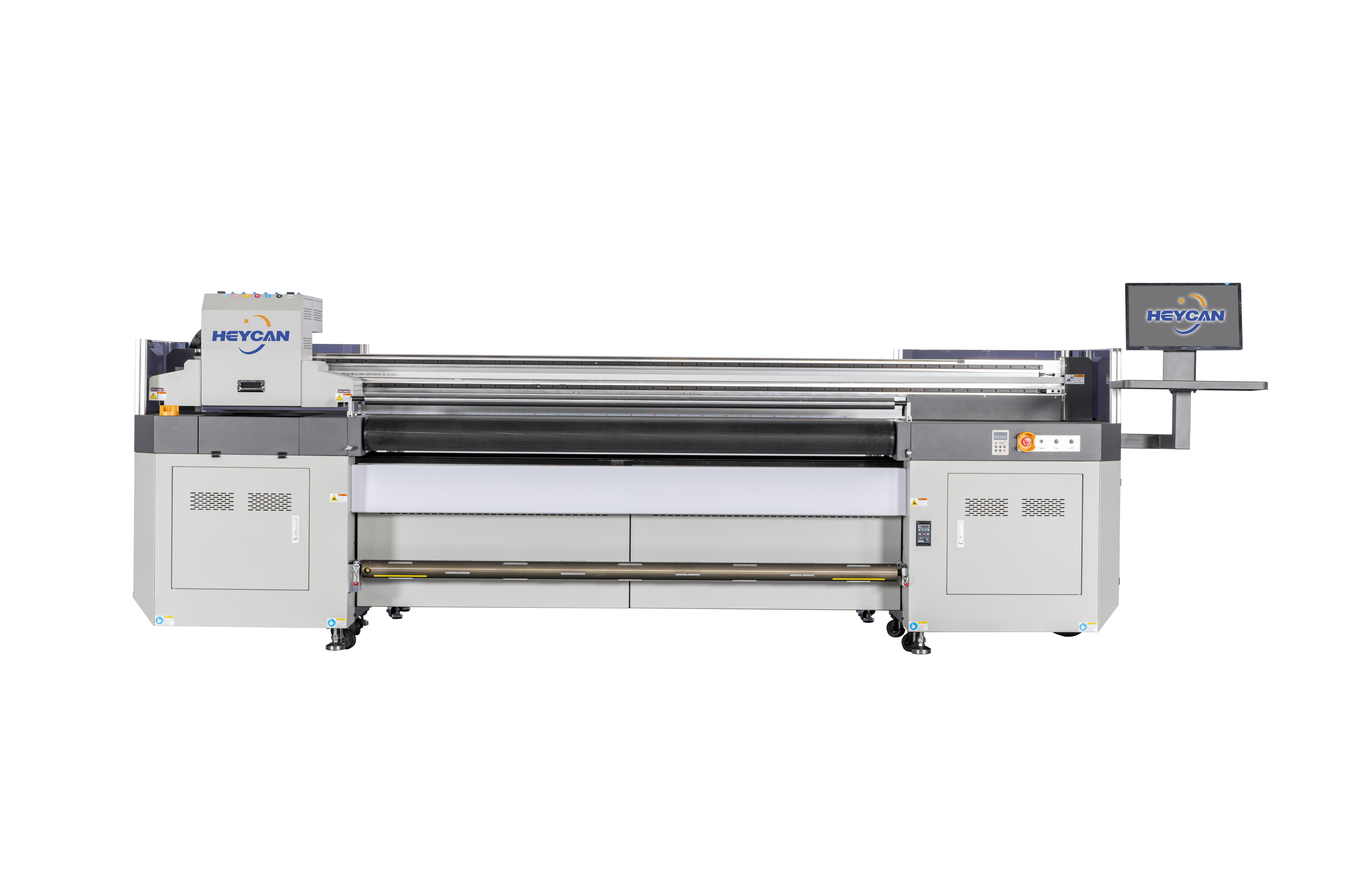 Heycan UV Hybrid printer is specially designed for small and medium-sized processing enterprises to meet their multi-functional requirements. Equipped with Ricoh Gen5/ Gen6/ KM1024i / Kyocera Grey-scale piezoelectric print heads. Heycan 2m Hybrid uv printing machine can print in hi-speed as well as hi-precesion in 7 colors. The draft mode speed up to 65 m²/hr, which balanced the needs of speed and the output quality in addition. The optional white and vanish also light up the multi-function. The machine installed with vacuum belt feeding and conveying system, so it be able to print not only all kind of flexible material including very elastic material like PVC soft file, but also most of rigid standard sized sheets. The hybrid digital printer installed two extension tables at its front and back, which gives the posibility to print longer sheets in less deviation continually.